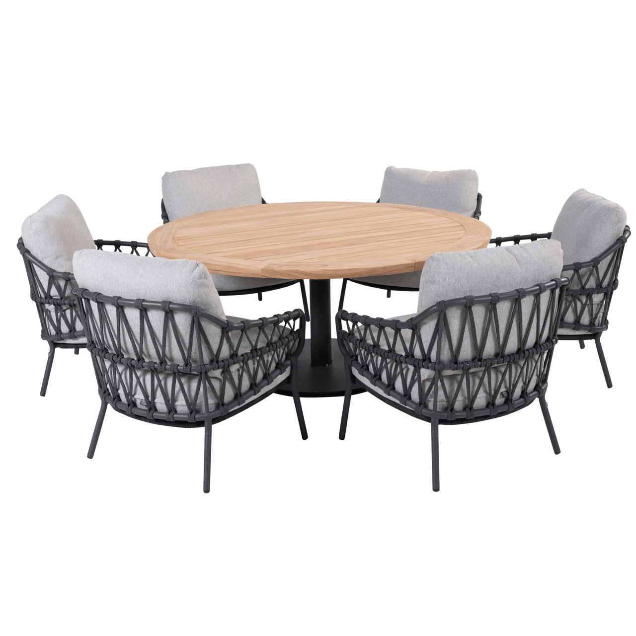 The set includes six Calpi Low Dining Chairs and the Saba Table, a 160cm round low-dining table. The chairs come with a 5-year warranty, ensuring their long-lasting quality. With weatherproof cushions and an anthracite stainless steel frame with marine-grade rope, these chairs are built to withstand any weather conditions. The dimensions of the chairs are W: 61 D: 66 H: 79 cms, with a seat depth and height of 49 cms and an arm height of 66 cms.