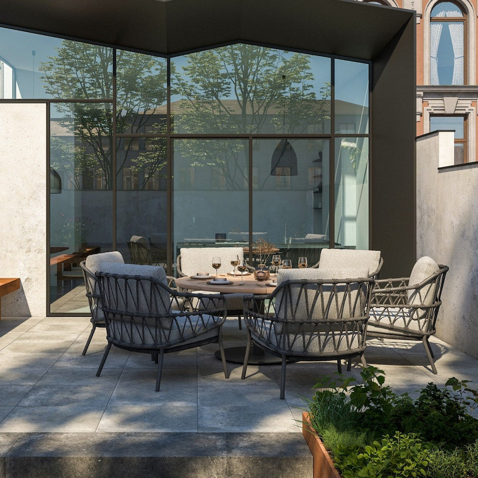 The Calpi 6 Seat Low-Round Outdoor Dining Set is the perfect addition to any outdoor space. With its unique design and exceptional functionality, this dining set will impress. Made with the perfect balance of exposed frames and knotted rope patterns, the Calpi set combines style and durability.