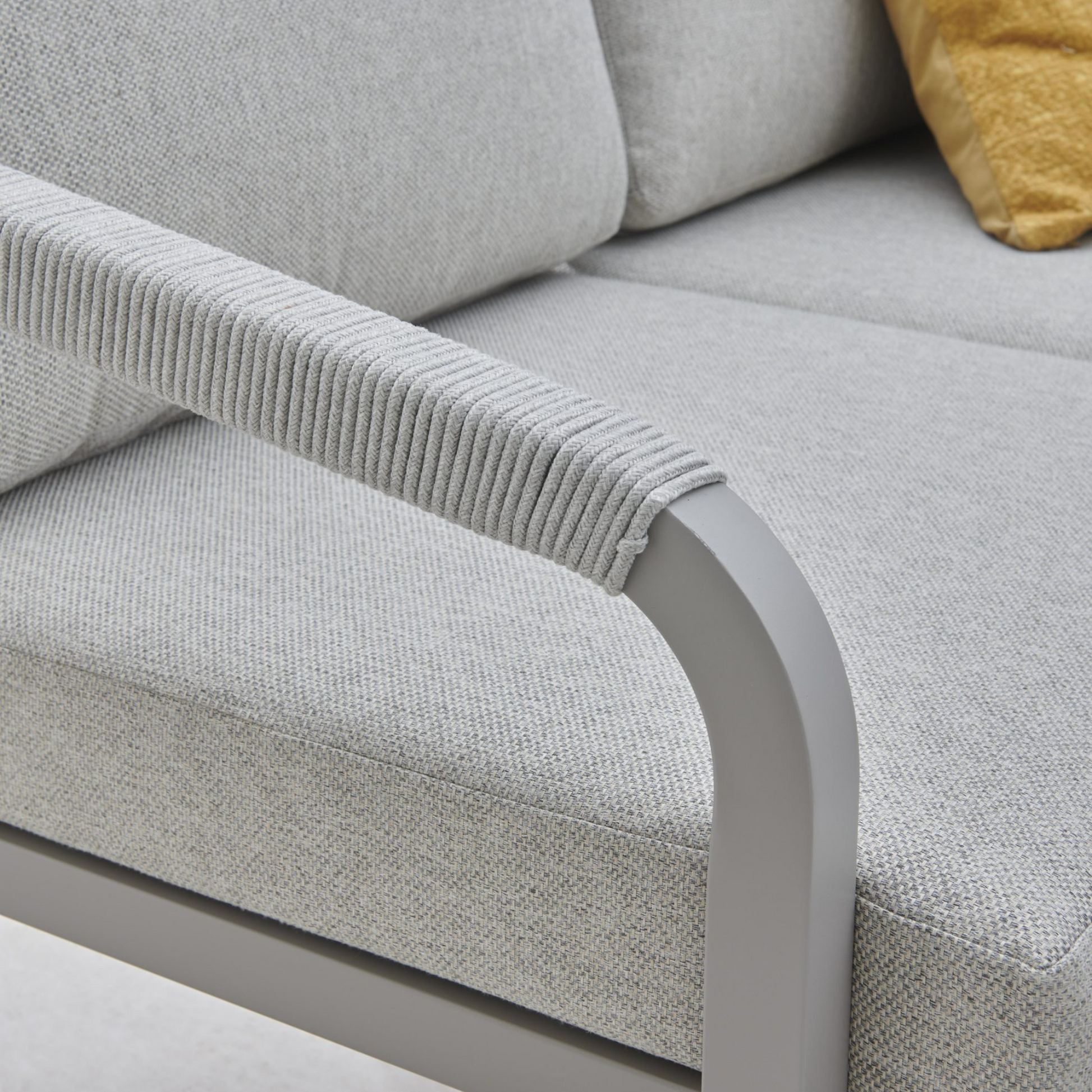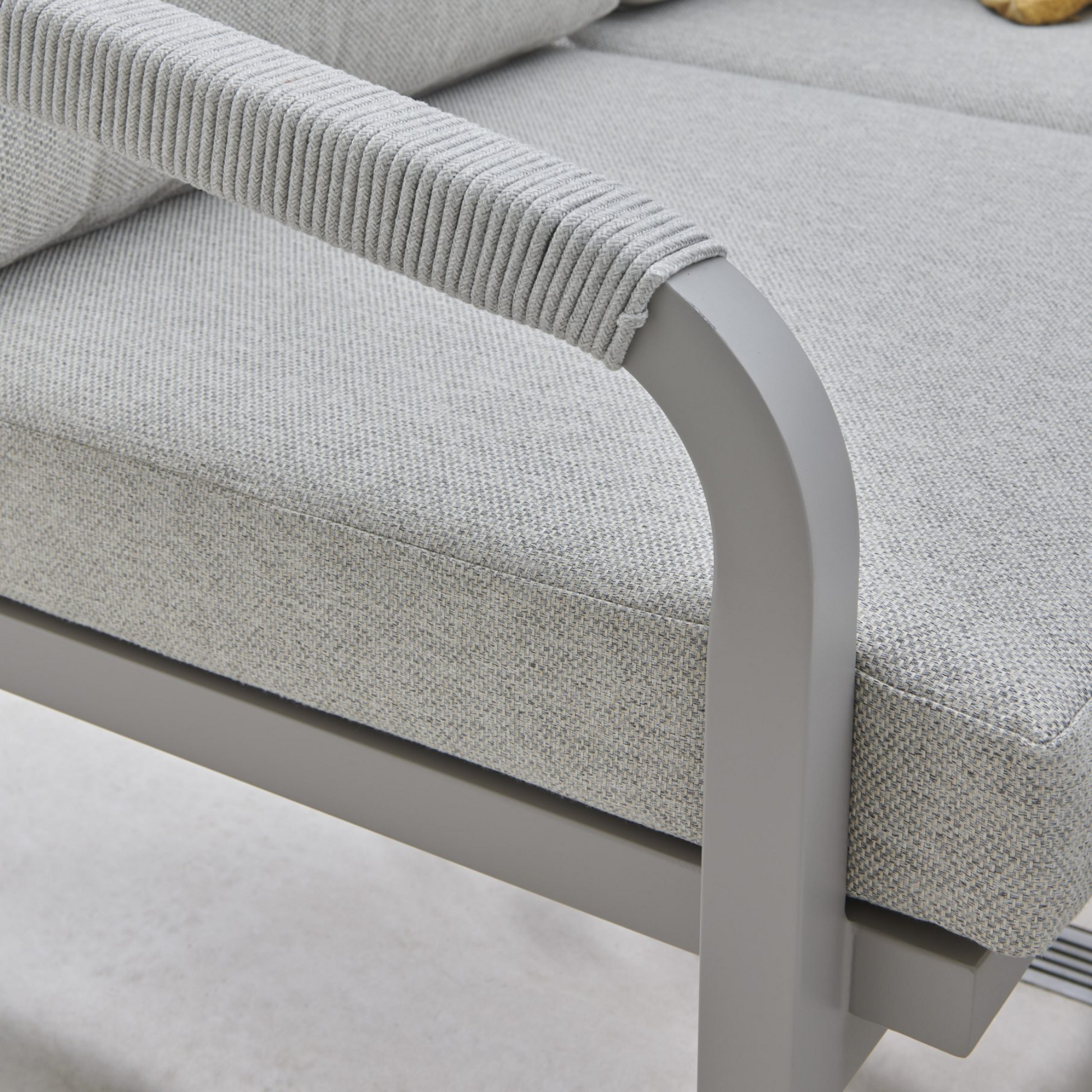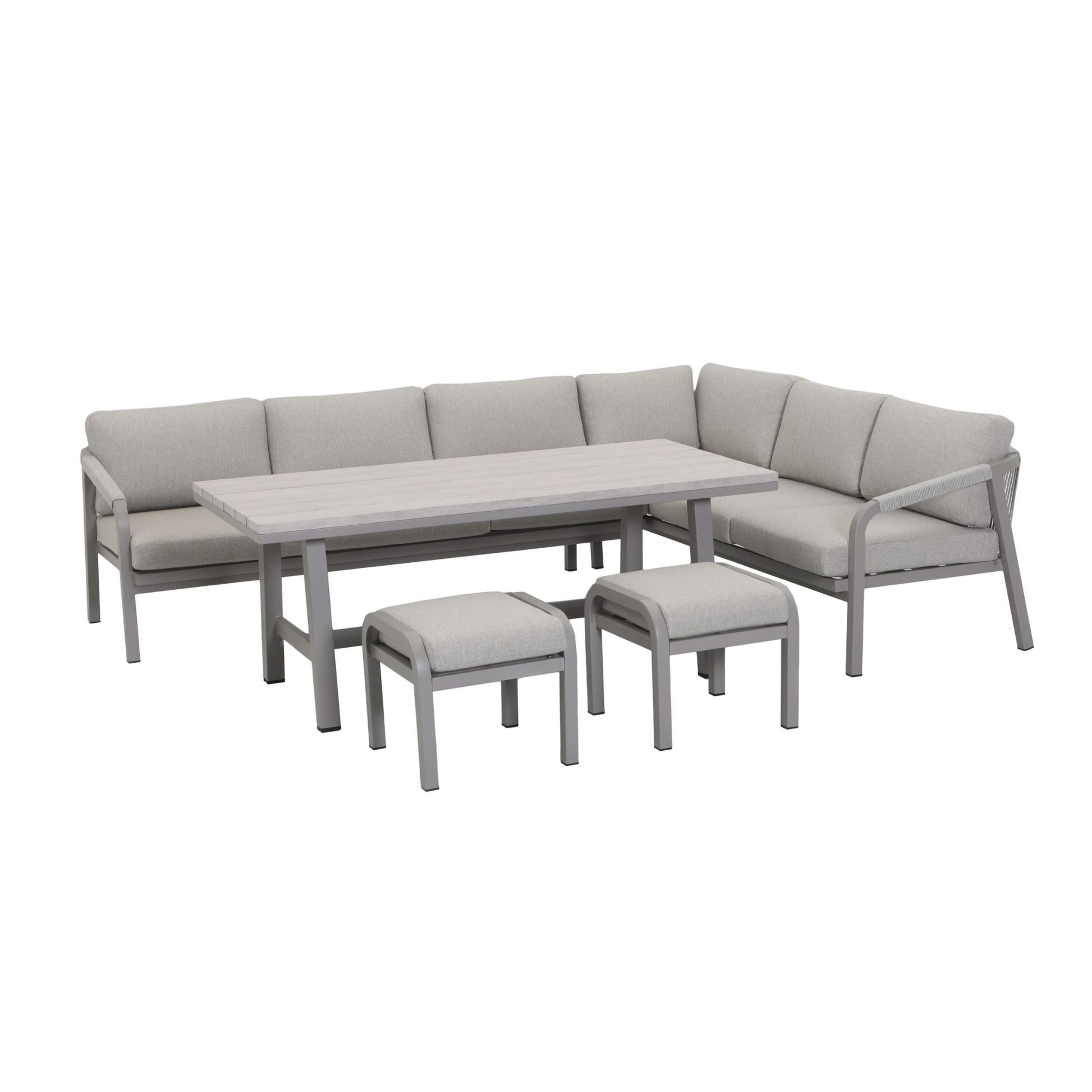 Introducing the Como Corner Lounge/Dining Set with Footstools. This stunning set brings both style and versatility to your outdoor space with its distinctive colourway and modern design. Featuring a spacious corner sofa with plush cushions, two footstools with matching cushions and a unique wood-effect slat top casual dining table, this set is perfect for both dining and lounging. The lightweight yet durable aluminium frame paired with a polyester rope back adds a contemporary touch to any garden or patio. Elevate your outdoor entertaining with the Como set and enjoy both comfort and style throughout the summer.