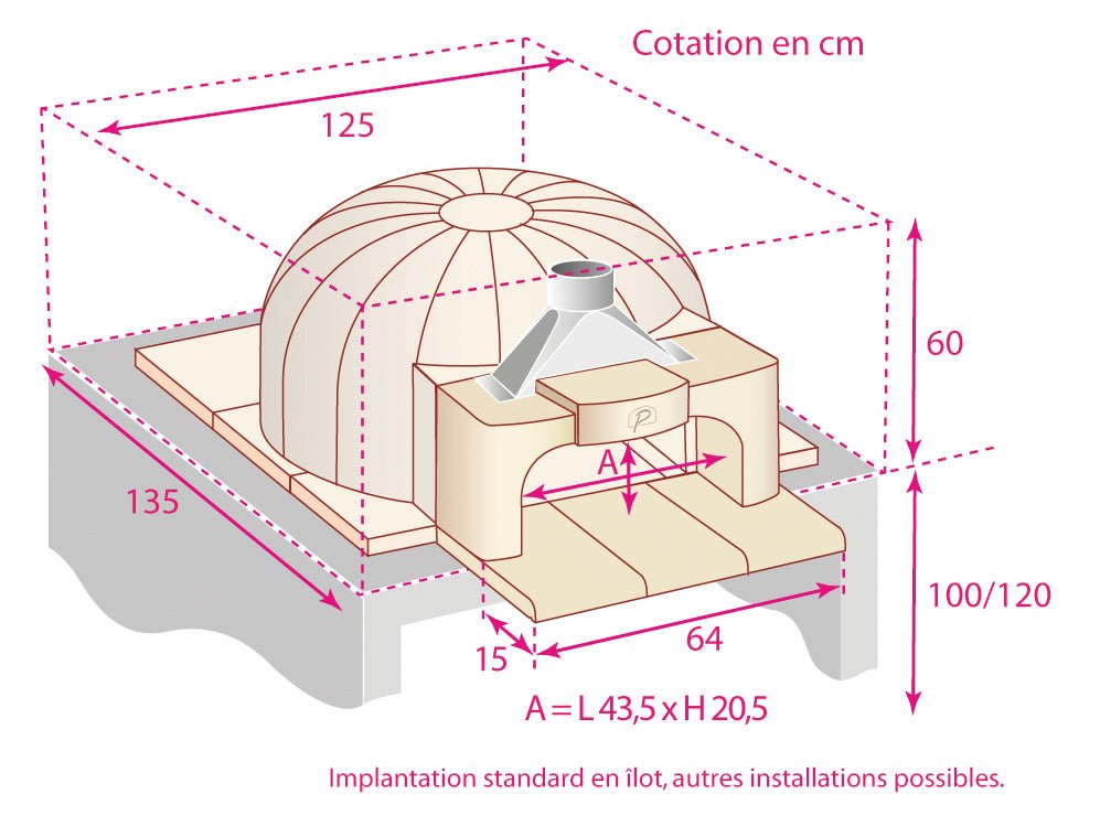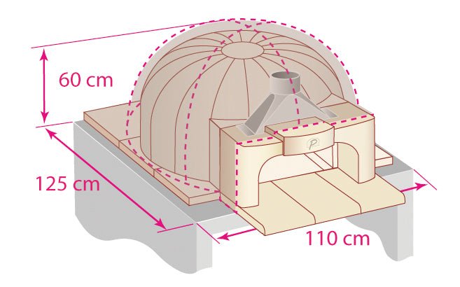 Ø interior 66 cm Ø exterior 87 cm Weight 515 kg Cooking surface 0.34 m² Opening 43.5 x 20.5 cm Interior Height 34 cm Exterior Height 50 cm Floor tile thickness 6 cm Arch stone thickness 10,5 cm Insulation with chamotte 3 cm Minimum dimensions of the oven all inclusive - cubic shape L125xP135xH60 cm Minimum dimensions of the oven all inclusive - rounded shape L110xP125xH60 cm